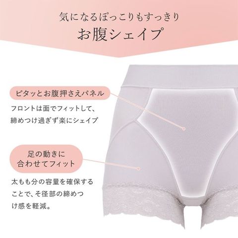 フロントは共生地で裏打ちした二重構造の「ピタッとお腹押さえパネル」仕様。お腹を面でやさしく押さえつつ締めつけすぎない程度にシェイプし、ウエストは身生地を折り返した幅広ベルトが面でフィットして、食い込みを抑えた楽なはき心地です。