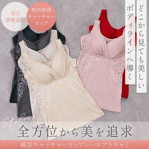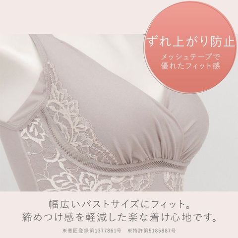 バストを立体的に包み込む特許取得のオリジナル開発の『キャッチャーカップ』を使用。カップの3本の縦ラインがバストをキャッチして立体的に馴染ませ、ワイヤーブラのようなバストシルエットを作ります。意匠登録のメッシュテープはバスト周りに沿いやすく、ワイヤーなしで締め付け感の少ない快適な着心地に。