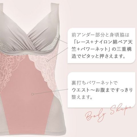 カップ脇に施された独自の補整機能と、脇部分のレースと身生地とパワーネットの三重構造によりバストの横広がりを防ぎ、サイドをすっきり整えます。お腹は身生地とパワーネットの二重構造で、広い面積でお腹とウエストをすっきりと整え、バックは両サイドのみ裏打ちパワーネットを使用し、脇肉と腰肉を押さえてくびれラインを作ります。