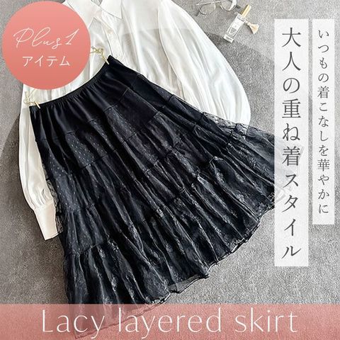テンセルモダールベア天竺にドット柄&小花柄レースを切り替えた、着こなしを格上げしてくれる重ね着スカートです。シルエットは膝下丈のAライン。裾に向かってチュールレースのギャザー量を段階的に増やすことで、広がりすぎず、ふんわりとエアリーな立体感を演出します。