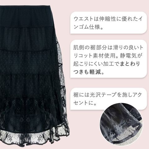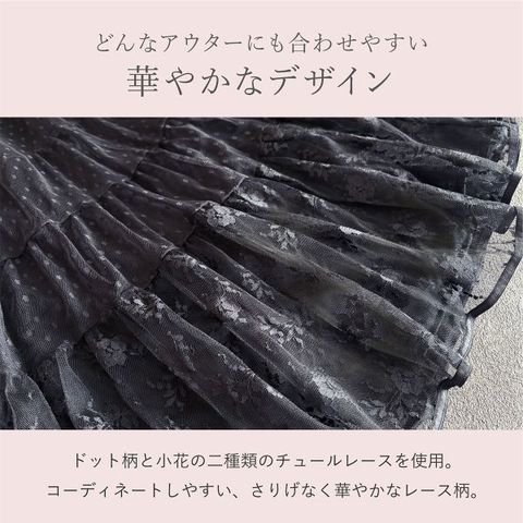 260209 スカート 重ね着 インナー ペチコート 膝下丈 Aライン 裾レース チュール 切り替え 透け防止 静電気 軽減 フレア エアリー ふんわり 立体感 大人可愛い フェミニン 華やか 上品 レディース ファッション コーディネート レイヤード 下着 透けない 3-sa