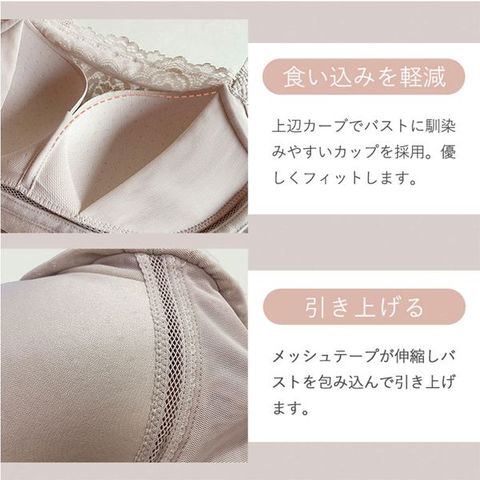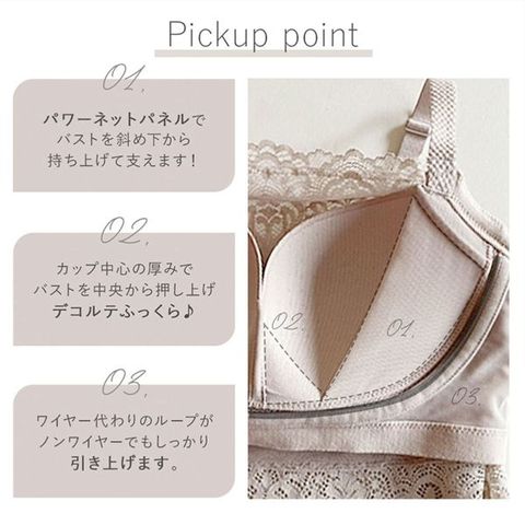 カップ周りをぐるっと包むバストアップループが、ワイヤーの代わりにバストをしっかり支えて下垂を防止し引き上げます。ストラップと連動した立体プッシュアップパネルが、バストを斜め下から支えて中央にキープし、バストの引き上げ効果をアップ!
