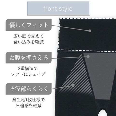 フロントは身生地にパワーネットを裏打ちした二重構造でお腹をシェイプ。前ウエストは幅広パネルにパワーネットを内蔵し、面で支えて折れ曲がりや巻き込みを軽減。後ろウエストはパワーネットを抜き、楽なはき心地で腰に優しくフィットします。