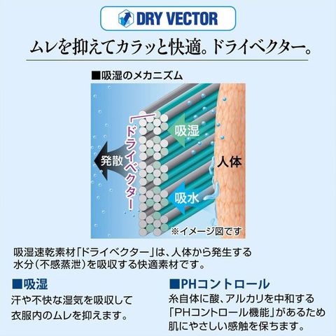 ドライベクターは抗菌防臭機能も備わった糸なので、繊維上の細菌の増殖・汗臭の発生を抑制します。さらに、汗や洗剤などによってアルカリ化されやすい繊維を中性に保ち、肌に優しい感触を保つpHコントロール機能付き。