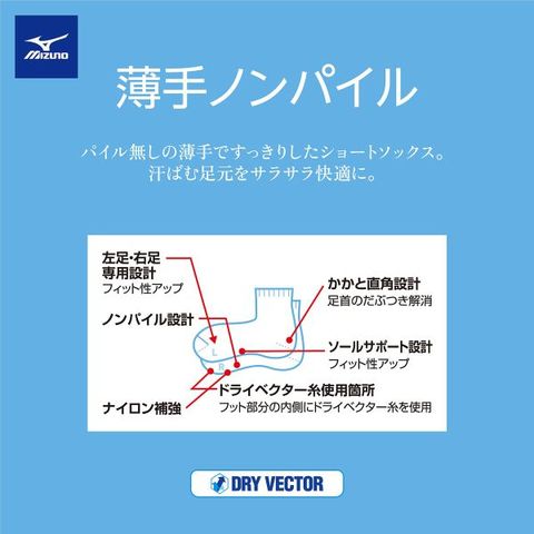 ミズノ MIZUNO ドライベクター 薄手 ノンパイル ショート丈 靴下 レディース 吸湿速乾 抗菌防臭 ムレ ニオイ