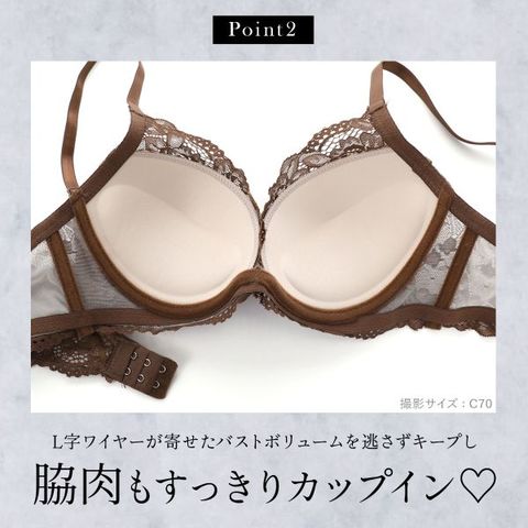 ブラは脇肉を谷間に変える脇高設計。もっちり下厚のモールドカップがバストを底から押し上げ、ふっくら美谷間をメイク。脇に高さのあるL字のカップラインが寄せたバストボリュームを逃さずキープし、気になる脇肉もすっきりカップイン。