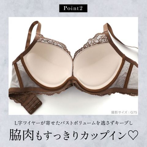 ブラは脇肉を谷間に変える脇高設計。もっちり下厚のモールドカップがバストを底から押し上げ、ふっくら美谷間をメイク。脇に高さのあるL字のカップラインが寄せたバストボリュームを逃さずキープし、気になる脇肉もすっきりカップイン。