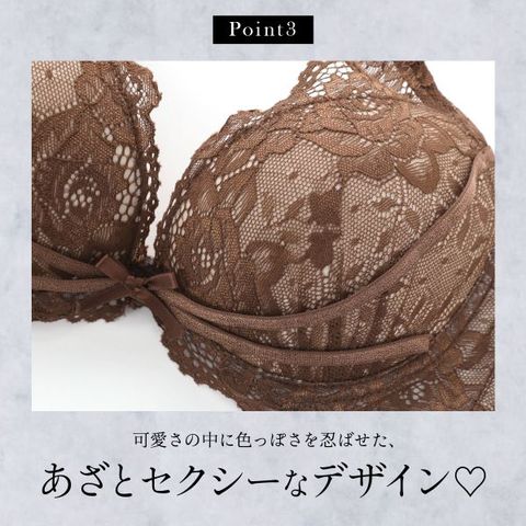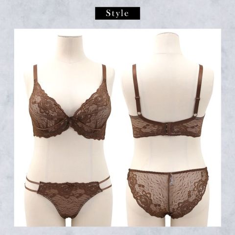 | 仕 様 | ブラ ・脇高設計 ・3/4カップ ・ホックの数:3段3列 ・下厚内蔵モールドカップ(パッド受けなし) ・L字ワイヤー入り ・肩紐取外し:不可 ・サイドボーン:あり ショーツ ・伸縮性:あり ・クロッチ:付き ・透感:あり(フロント裏打ち付き) |
