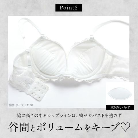 ブラは脇肉を谷間に変える脇高設計。脇に高さのあるL字のカップラインが、寄せたバストボリュームを逃さず谷間をキープし、気になる脇肉もすっきりカップイン。