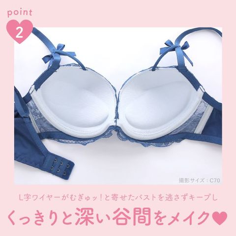 ブラは脇肉を谷間に変える脇高設計。L字のカップラインと高めのサイドボーンで気になる脇肉もすっきりカップイン。もっちり下厚のモールドカップがバストを底から押し上げ、ふっくら美谷間をメイクします。着けるだけで自然で丸みのある綺麗なシルエットに☆