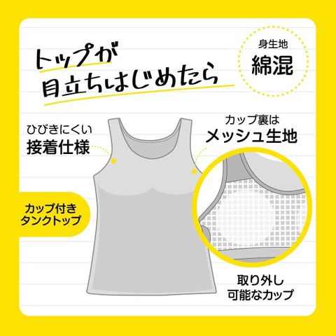 学校生活に!アクティブな女の子に!アツギが成長段階に合わせて考えた、はじめてブラをする女の子のための下着ブランド「ハイジュニ」の透けにくいカラーのタンクトップです。