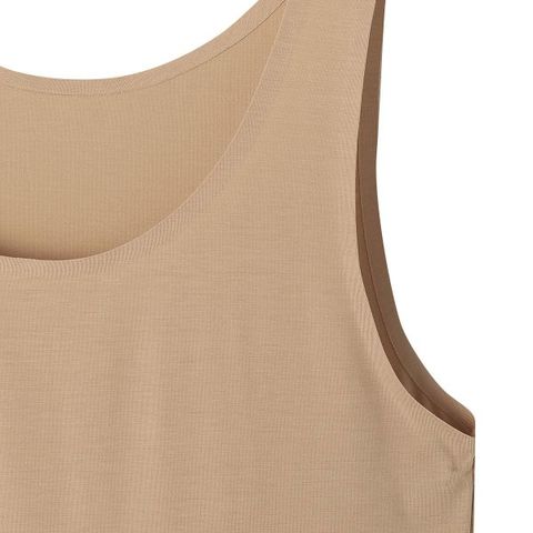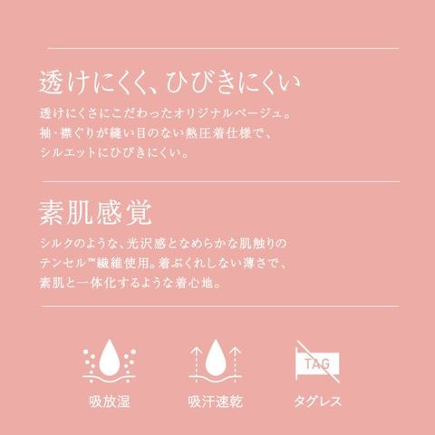ASTIGUからスッと素肌になじむインナータンクトップが登場しました。透けにくさにこだわった特徴的なベージュカラーがポイントです。袖、襟ぐり部分は熱圧着仕様で、シルエットに響きにくいのが嬉しいポイントです。肌触りは、シルクのような光沢感と滑らかな肌触りの「テンセル」繊維を仕様。着ぶくれしない薄さで素肌と一体化するような仕様になっています。