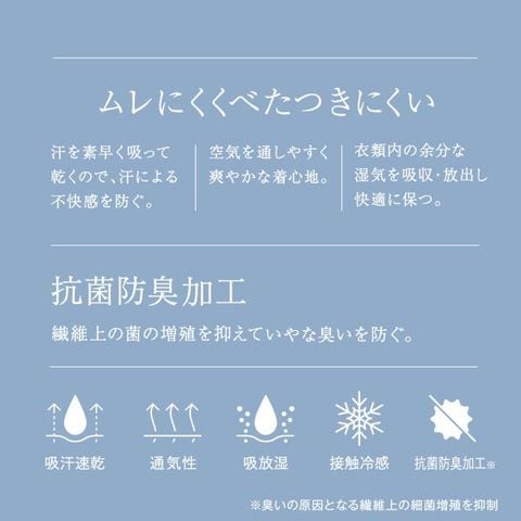吸汗速乾性と吸放湿性に優れ、汗をかいてもすぐに乾き、さらっとした着心地。