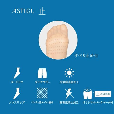 | 仕 様 | ・ヌードトゥ ・ダイヤマチ ・光触媒消臭加工 ・ノンスリップ仕様 ・パンティ部メッシュ編み ・静電気防止加工 ・バックマーク付き |