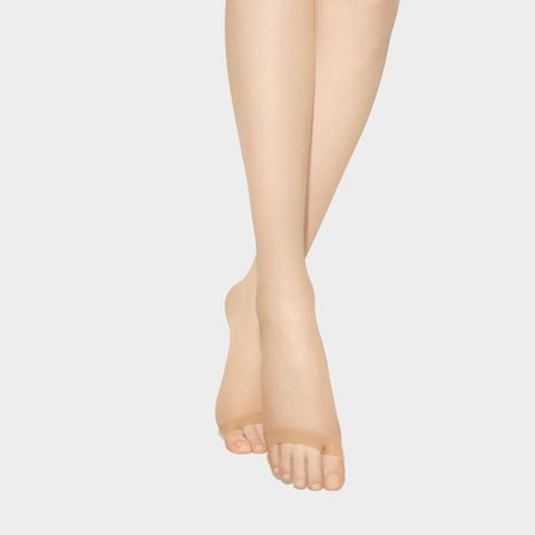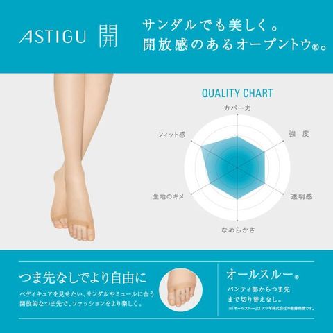 サンダルでも美しく。開放感のあるオープントゥ仕様のストッキングです。パンティ部からつま先まで切り替えが無いオールスルー仕様です。