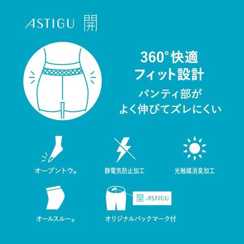 | 仕 様 | ・パンティ部が良く伸びてズレにくい仕様 ・オープントゥ ・静電気防止加工 ・光触媒消臭加工 ・オールスルー ・バックマーク付き |