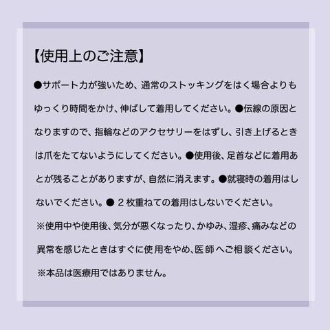| 仕 様 | ・着圧ストッキング(足首26hPa) ・ヒップアップ立体編み ・ダイヤマチ ・補強トゥ ※サポート力が強いため、通常のストッキングをはく場合よりもゆっくり時間をかけ、伸ばして着用してください。 |