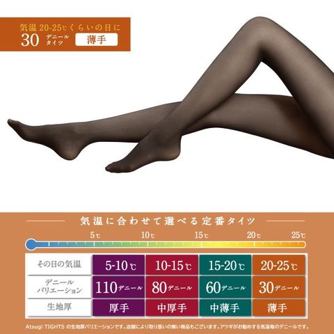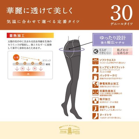 | 仕 様 | ・30デニール2足組 ・バックマーク付き ・蓄熱加工 ・ヌードトウ(つま先切り替えなし) ・抗菌防臭加工 ・静電防止加工 ・ソフトウエスト ・ヒップピッタリフィット ・リサイクルストレッチファイバー ・薄手 |
