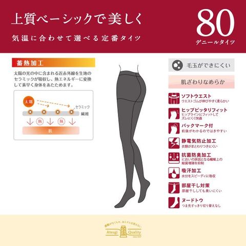 | 仕 様 | ・80デニール2足組 ・バックマーク付き ・蓄熱加工 ・ヌードトウ(つま先切り替えなし) ・抗菌防臭加工 ・静電防止加工 ・ソフトウエスト ・ヒップピッタリフィット ・リサイクルストレッチファイバー ・中厚手 |