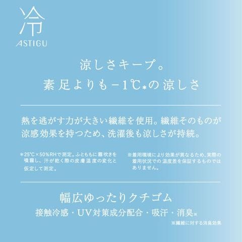 吸放湿性に優れた糸とフルダル糸を使用し、素足よりも-1℃涼しいので、暑い日でも涼しさをキープします。