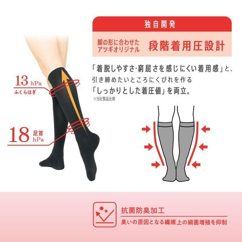 足首は18hPa、ふくらはぎは13hPaの着圧仕様で、脚をしっかりサポートします。