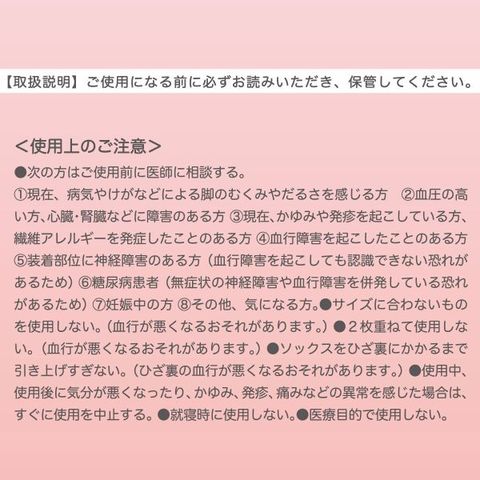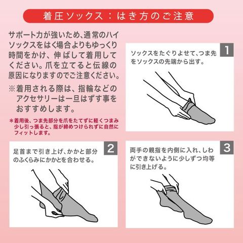 | 仕 様 | ・DCY交編 ・足首18hPa ・ふくらはぎ13hPa ・ヌードトウ ・コンベンショナルヒール ・抗菌防臭加工 ・足型セット加工 ※サポート力が強いため、通常のハイソックスをはく場合よりもゆっくり時間をかけ、伸ばして着用してください。爪を立てると伝線の原因になりますのでご注意ください。着用される際は、指輪などのアクセサリーは一旦はずす事をおすすめします。 |