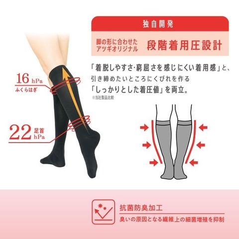 足首22hPa、ふくらはぎ16hPaの段階的な着圧で、脚をしっかりサポートします。