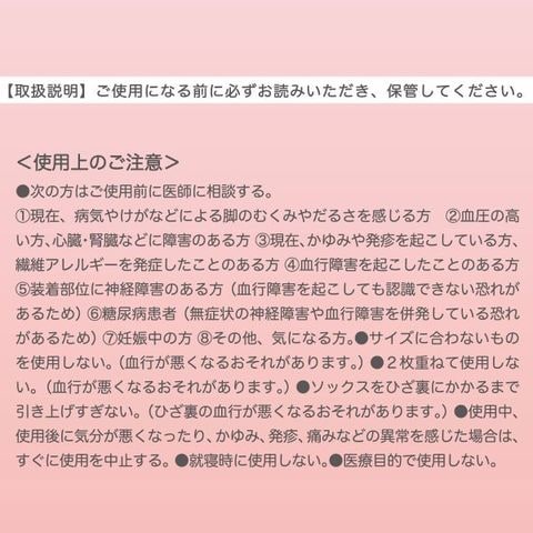 | 仕 様 | ・DCY交編 ・足首22hPa ・ふくらはぎ16hPa ・ヌードトウ ・コンベンショナルヒール ・抗菌防臭加工 ・足型セット加工 ※サポート力が強いため、通常のソックスをはく場合よりもゆっくり時間をかけ、伸ばして着用してください。爪を立てると伝線の原因になりますのでご注意ください。着用される際は、指輪などのアクセサリーは一旦はずす事をおすすめします。 |