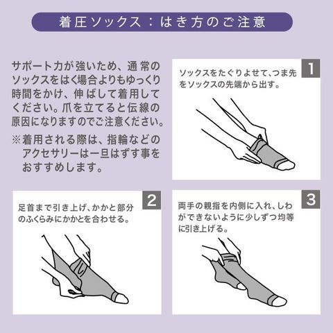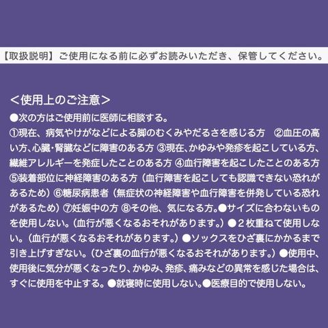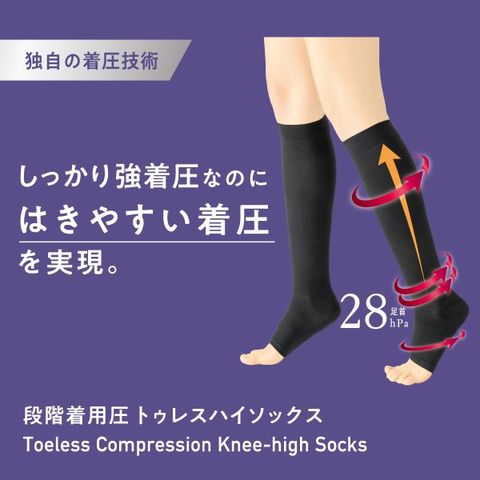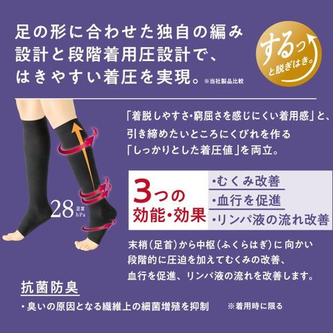 | 仕 様 | ・DCY交編 ・メディカルライン(一般医療機器) ・足首28hPa ・オープントウ ・コンベンショナルヒール ・抗菌防臭加工 ・足型セット加工 ※サポート力が強いため、通常のソックスをはく場合よりもゆっくり時間をかけ、伸ばして着用してください。爪を立てると伝線の原因になりますのでご注意ください。着用される際は、指輪などのアクセサリーは一旦はずす事をおすすめします。 |