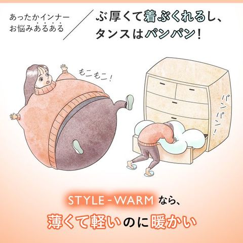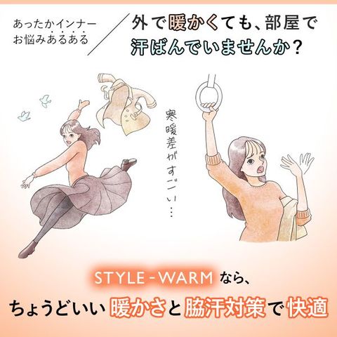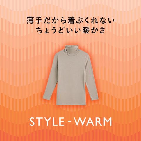 綿インナーなどは汗がこもりやすい特徴があります。STYLE-WARMでは吸湿速乾性のある素材を採用しており、水分が乾きやすい仕様です。脇部分には汗ジミ対策でパッドを付けているので脇汗がにじんでくる不安を解消しました。