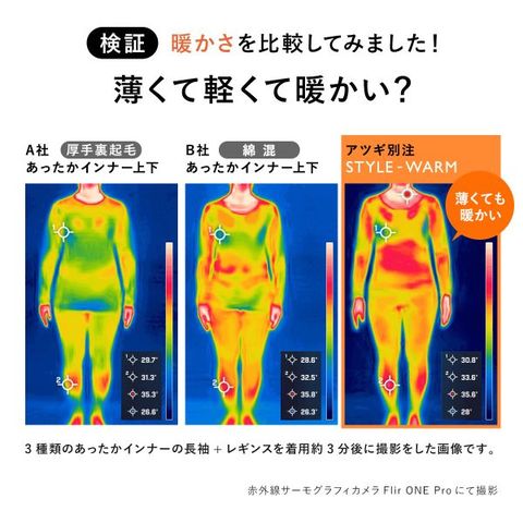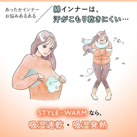 綿インナーなどは汗がこもりやすい特徴があります。STYLE-WARMでは吸湿速乾性のある素材を採用しており、水分が乾きやすい仕様です。