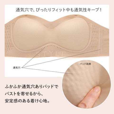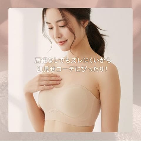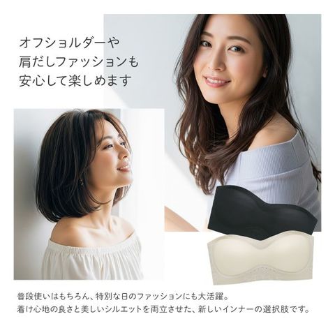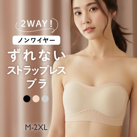 とろけるようなつけ心地の、2WAYノンワイヤー ずれない ストラップレスブラ (ベアトップ)。伸縮性抜群の生地が身体の動きに合わせて柔軟にフィット。締め付け感の少ない着け心地で、快適さを一日中キープします。