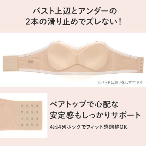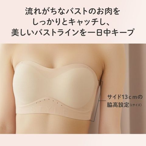 「ノンワイヤーだと横に流れてしまいそう…」そんな心配もご無用。サイド約12cmの脇高設計(Mサイズ)が、流れがちなバストのお肉をしっかりとキャッチし、美しいバストラインを一日中キープします。ベアトップで心配な安定感も4段4列ホックがしっかりサポート。