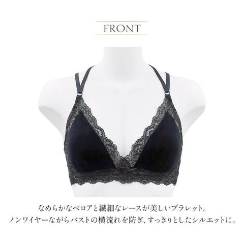 なめらかなベロアと繊細なレースが美しいブラレット。ノンワイヤーで軽やかなつけ心地ながら、サイドのチュールネットがバストの横流れを防ぎ、すっきりとしたシルエットに。柔らかなベロア生地が、肌に溶けこむようなソフトな着用感とラグジュアリーな印象を演出します。
