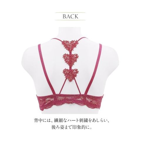 着脱しやすいフロントホックのブラジャー。背中には、繊細なハート刺繍をあしらい、後ろ姿まで印象的に。インポートランジェリー特有の、抑制の効いた甘さとロマンチックな余韻を演出する一着です。