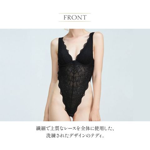 繊細で上質なレースを全体に使用した、洗練されたデザインのテディ。肌が透ける美しいレースの質感がセンシュアルなデザインです。ウエストまでの深いハイレッグのカッティングがすっきりとしたシルエットとモードな雰囲気を演出します。