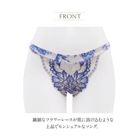 繊細なフラワーレースが肌に溶け込むような、上品でセンシュアルなソング。バックスタイルには華奢なリボンを添えて、さりげなく可憐なアクセントをプラス。美しいレースの透け感が大人の魅力を引き立て、軽やかな履き心地でストレスフリーなフィット感を実現。フロントにはレースと同色の肌触り柔らかなチュール生地を裏打ち。バックリボンは結びほどきが可能です。