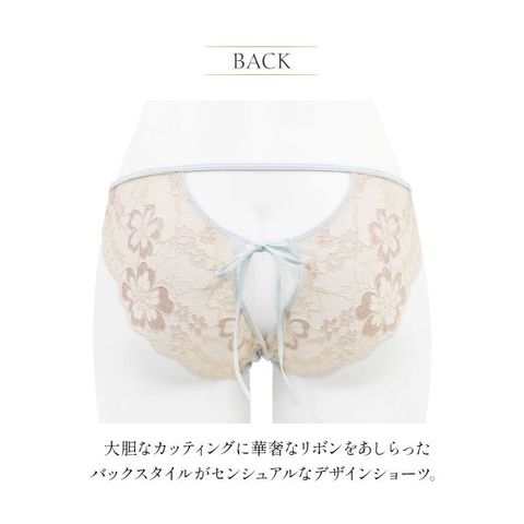 大胆なカッティングに華奢なリボンをあしらったバックスタイルがセンシュアルなデザインショーツ。大胆かつ繊細なラインが、女性らしいシルエットを美しく演出します。