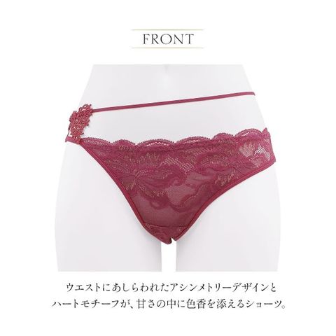 ウエストにあしらわれたアシンメトリーデザインとハートモチーフが、甘さの中に色香を添えるショーツ。インポートならではの遊び心のあるデザインは、日常にロマンチックな彩りを添えます。