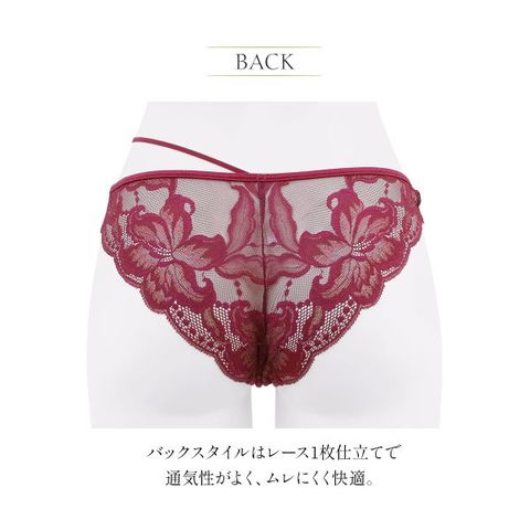 バックスタイルはレース1枚仕立てで通気性が良く、ムレにくく快適。フロント部分には、レースと同色のやわらかな生地を裏打ちし、肌あたりも優しく仕上げました。同コレクションでのコーディネートがおすすめです。