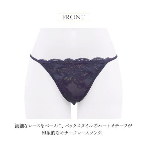 繊細なレースをベースに、バックスタイルのハートモチーフが印象的なモチーフレースソング。ミニマルなシルエットがヒップラインをシャープに引き立て、後ろ姿を華やか、且つセンシュアルに演出します。フロントには肌触りの良いチュール生地を裏打ちし、透けにくさと快適な着心地を両立しました。