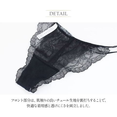 ラメ糸が織り込まれた煌めくレースが素肌に溶け込むレースソング。バックスタイルは潔いGストリング。ヒップにやさしく寄り添い、ストレスフリーな履き心地に。上品な煌めきを忍ばせた、ミニマルでエレガントなデザインです。