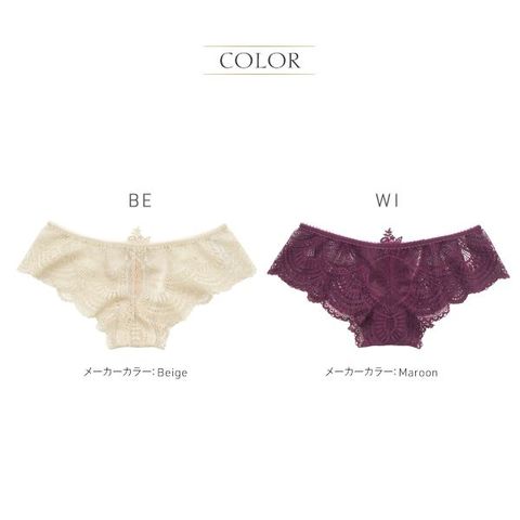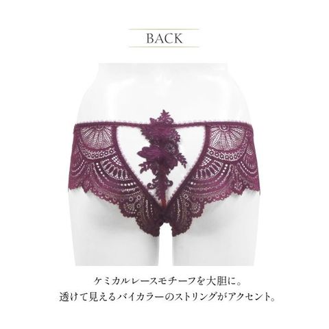 華やかなオリジナルレースとバイカラーが印象的なコレクション“Royal3”。女性らしいMaroonと肌なじみの良いBeigeの2色展開。バックをV字にカットし、緻密でゴージャスなケミカルレースモチーフを大胆にあしらいました。レースモチーフからひっそりと透けて見えるバイカラーのストリングがアクセント。フロントはレースと同色の柔らかなチュール生地を裏打ちし、程よい透け感に。
