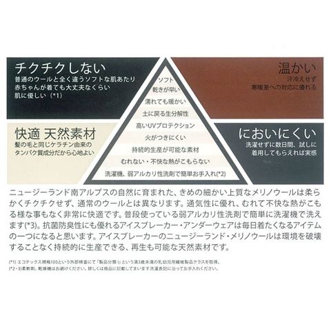 メリノウールのチクチクしにくい優しい肌触りやにおいにくさなど、アンダーウエアに適した特性を活かしたアイテムです。ナイロン芯にメリノウールを巻きつけたコアスパン糸を採用することで、摩耗や引き裂きに対する強度が向上。アンダーウエアに求められる、こまめな洗濯での耐久性を確保。さらにストレッチ性を持たせるためにポリウレタンを交編しており、しなやかにフィットします。