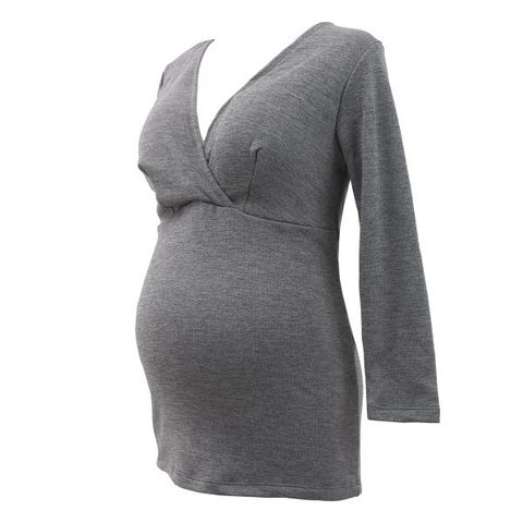 妊婦さんも安心して着られる丈長めの設計で、大きくせり出すお腹もすっぽり包み込みます。胸もとはカシュクール仕様。片手でさっと胸が出せるので産後の授乳にも便利。