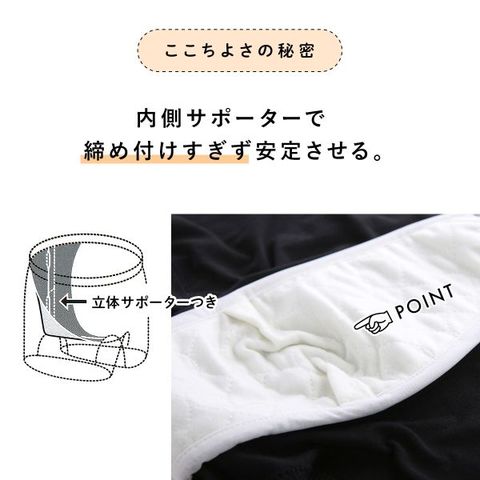 | 仕 様 | ・内側に立体サポーター付き ・前閉じ ・吸水量約40cc ・4層構造 ・サイド部分防水仕様 |