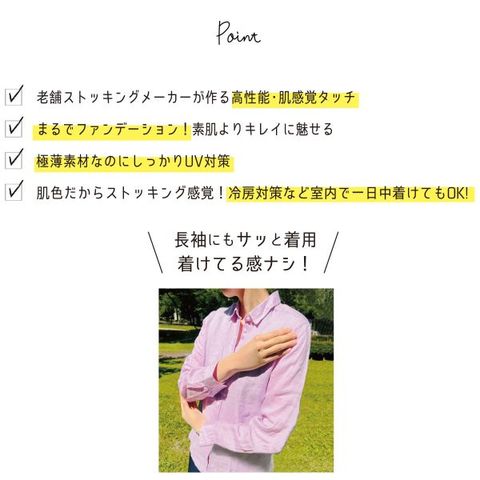 手のストッキングでUV対策! 毎年大好評の太陽に負けないアームカバーにショート丈が登場。薄手なのにUVカットでしっかり紫外線対策!老舗ストッキングメーカーが作る極薄+伝線しにくく、キレイに素肌魅せをしてくれる商品です。 ショートタイプなので着脱しやすく、長袖コーデでもごろつきにくくおすすめ!高性能・肌感覚タッチで、素肌よりキレイ魅せ!シミや傷、シワをカバーしてくれるまるでファンデーションのようなアイテム!冷房対策など室内で一日中着けてもOK!便利な親指穴付きで普段の動作の邪魔をしません!伸縮性が高く、体型を問わず着用頂けます。