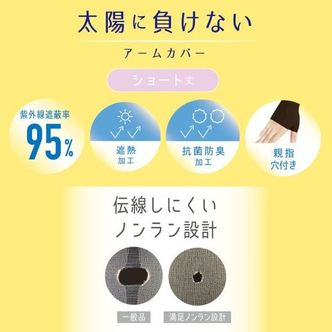| 仕 様 | ・日本製 ・ショート丈(親指穴付き) ・紫外線遮蔽率(UVカット率):ベージュが90% ブラックが95% ・遮熱加工 ・抗菌防臭加工 |