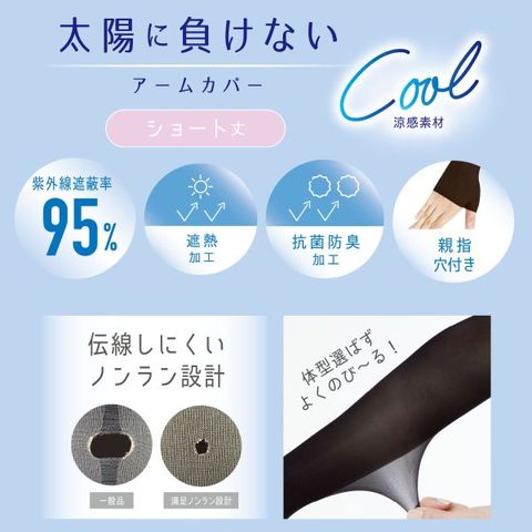 手のストッキングでUV対策! 毎年大好評の太陽に負けないアームカバーにショート丈が登場。薄手なのにUVカットでしっかり紫外線対策!老舗ストッキングメーカーが作る極薄+伝線しにくい キレイな腕線美を実現する商品です。 ショートタイプなので着脱しやすく、長袖コーデでもごろつきにくくおすすめ!高性能・肌感覚タッチのストッキング生地でピタッとフィット。冷房対策など室内で一日中着けてもOK!便利な親指穴付きで普段の動作の邪魔をしません!涼感素材を使用しているのでつけている方が涼しいかも!?伸縮性が高く、体型を問わず着用頂けます。