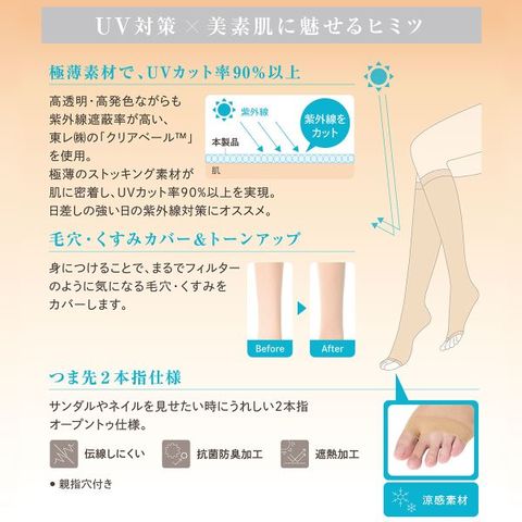 毎日の紫外線対策を、もっと手軽に。365日、絶え間なく降り注ぐ紫外線、日々忙しく過ごす中でも、紫外線対策をしたい。そんなあなたの生活に寄り添いながら、手間をかけずに肌を守る新感覚のUVケアブランドが誕生。「まとう、UVヴェール」東レ(株)の「クリアヴェール」を使用。高透明・高発色ながらも紫外線遮蔽率が高いストッキングのような極薄生地でUV遮蔽率90%以上を実現。肌に密着することで、自然な見た目でファンデーションのように気になる毛穴・キズ・くすみをカバーしてくれます。涼感素材と遮熱機能で暑さと強い日差しの季節にピッタリです。抗菌防臭加工でニオイ対策もGOOD!つま先が開いているオープントゥタイプなのでサンダル等でも合わせやすいですよ。